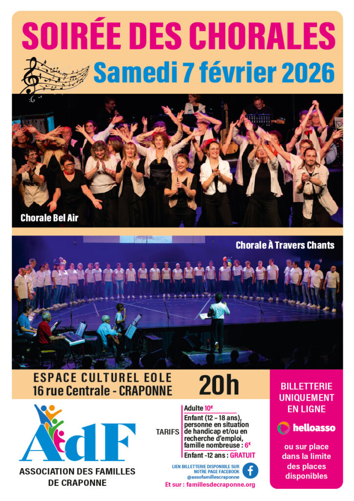 L’Association des Familles de Craponne propose le samedi 7 Février à 20h, à l’Espace Culturel Eole de Craponne la soirée des Chorales !